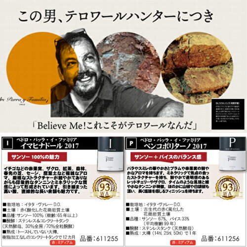 ワイナリー名Pedro Parra y Familia ペドロ・パッラ・イ・ファミリア ワイン名Imaginador イマヒナドール ヴィンテージ2017 容量 750ml / 12 原産国チリ 地 方サウス 地 区イタタ・ヴァレー 村 品質分類・原産地呼称イタタ・ヴァレーD.O. 格 付 品種サンソー 100% 醸造・熟成 醗酵:天然酵母使用、30%全房、70%全粒にてステンレス&コンクリ—トタンク醗酵 熟成:トーストしないフードレ(大樽)、エポキシ樹脂 ALC度数14.00 % キャップ仕様コルク 種類赤ワイン 色赤 味わいミディアムボディ 飲み頃温度14℃ コメント 赤果実やストロベリー、紅茶、ザクロ、森林、春先の芝、セージ、腐葉土などのアロマが広がります。