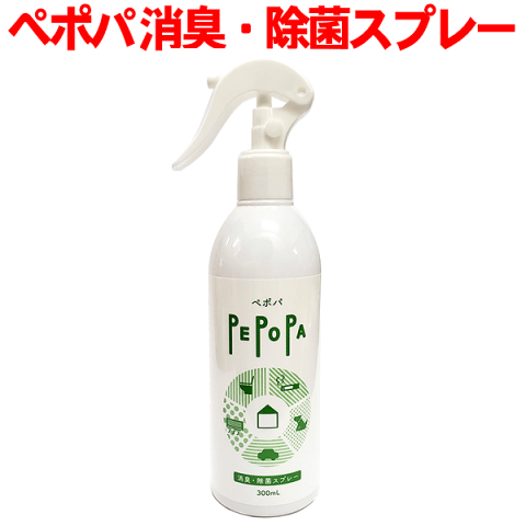 小さいお子様、高齢者、ペットにもご使用可能!◎ ペポパ消臭・除菌スプレー(PS-03-001) 内容量:300mL 内容成分:次亜塩素酸ナトリウム(食品添加物) 液性:弱アルカリ性 タバコ臭、ペット臭、体臭、汗のニオイ、食べ物のニオイ、おう吐臭、糞尿臭に作用する消臭・除菌スプレーです。