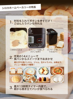 [ホームベーカリー 餅 シロカ siroca SHB-512 米粉 ジャム 生キャラメル ソフトパン]本体サイズ:幅275×奥行350×高さ290mm本体重量:約4.15kg温度ヒューズ:157℃電圧:AC100V周波数:50/60Hz消費電力:ヒーター:500W /モーター:50Wタイマー最長約13時間まで付属品/計量カップ×1、計量スプーン×1、羽取り棒×1、ジャム用ふた×1、取扱説明書(保証書、レシピ)×1材料を入れてメニューを選ぶだけ!ご飯を入れたパンも作れる!メニューは豊富な14種類!朝食にパンやジャム、おやつに生キャラメル、夕食にピザなど、これ1台で毎食楽しめます。