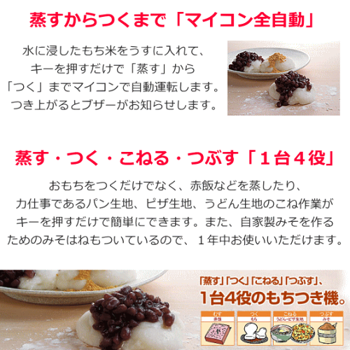 ・・・・・・・・・商品特長・・・・・・・・・ 蒸すからつくまで 「マイコン全自動」 水に浸したもち米をうすに入れて、 キーを押すだけで「蒸す」から「つく」まで マイコンで自動運転します。