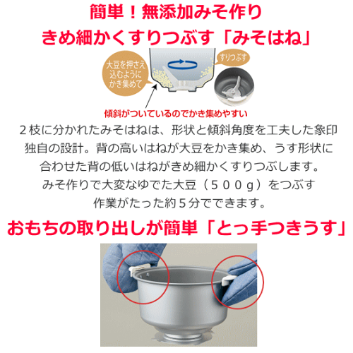 きめ細かくすりつぶす「みそはね」 2枝に分かれたみそはねは、形状と傾斜角度を 工夫した象印独自の設計。