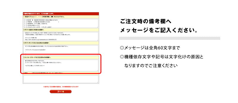 ご注文の際、備考欄へ全角60字以内でご記入下さい。