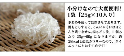 無添加・食物繊維豊富!ダイエットにも最適!ヘルシー食材乾燥こんにゃく 1袋25g×10入り小分けなので、食べやすくなっており、大変便利!! 麺の代わりに!鍋料理に!サラダにも!使い方いろいろ! 水あめを使って乾燥させております。